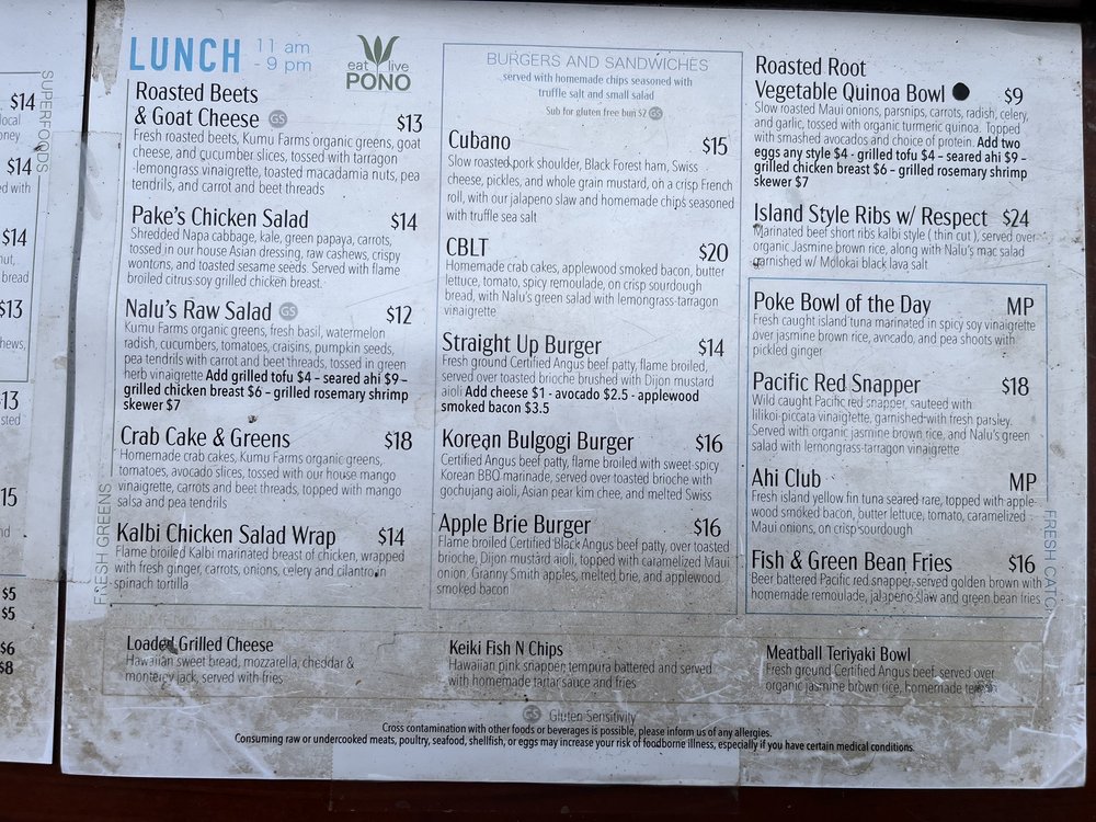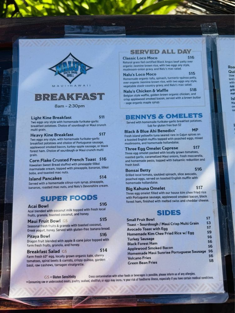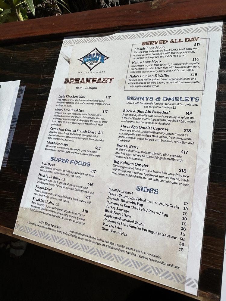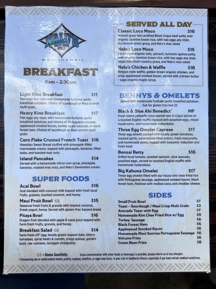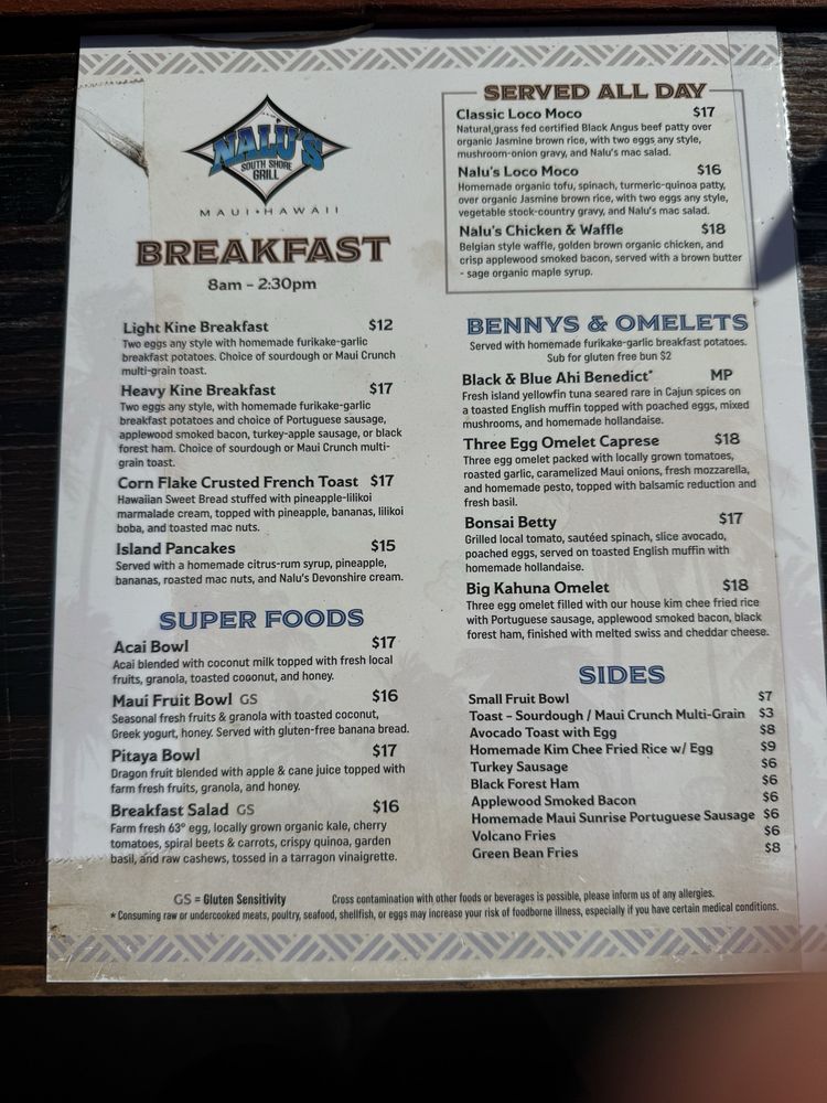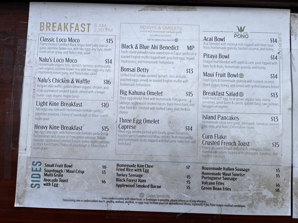 Two eggs any style, with homemade furikake-garlic breakfast potatoes and choice of Portuguese sausage, Italian sausage, applewood smoked bacon, turkey-apple sausage, or black forest ham. Choice of sourdough or Maui crunch multi grain.